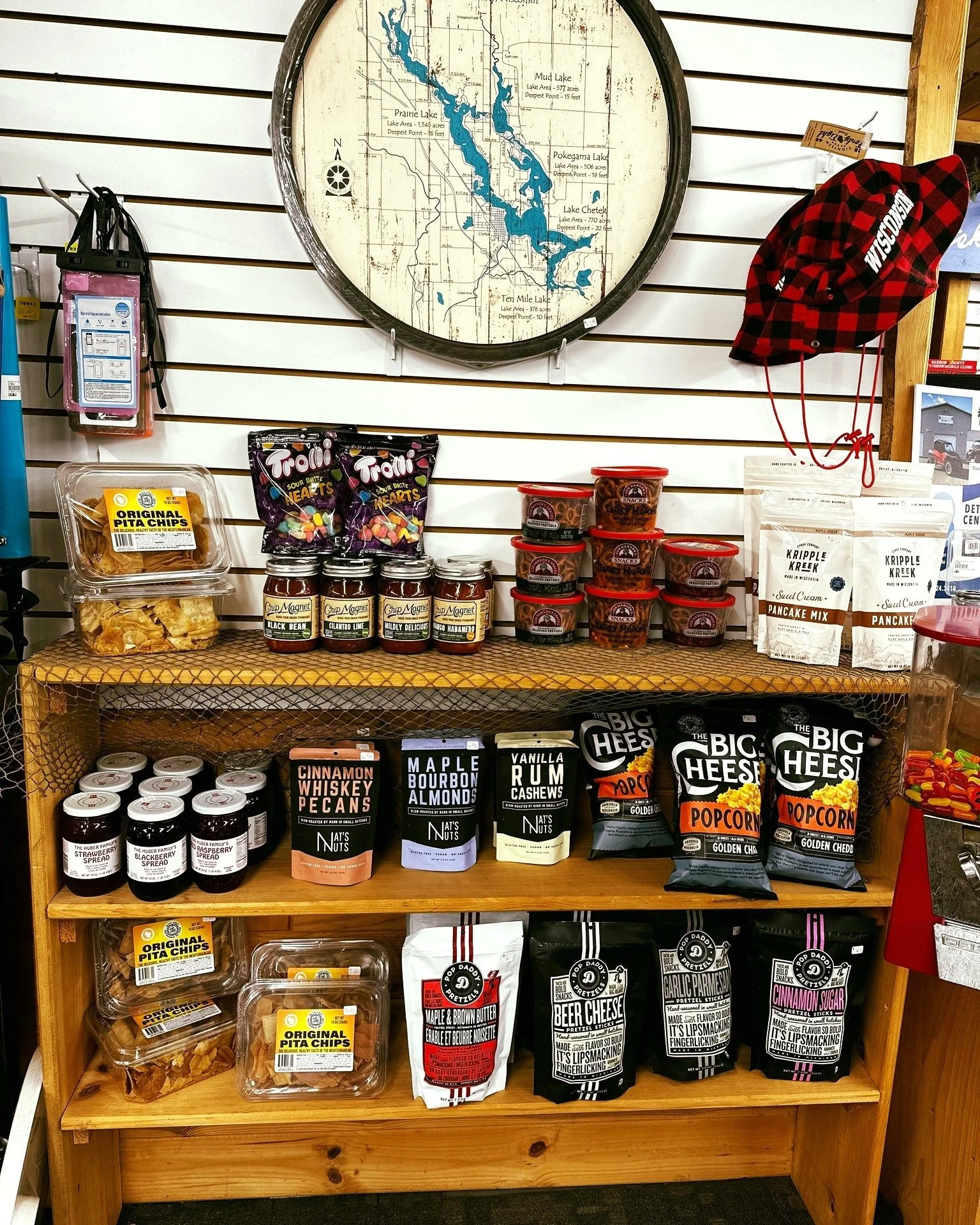 Husnik Beef Sticks, , Louis Finer meats snacks. Chip Magnet, Water Street pita chips from Eau Claire, Nats nuts, Pop Daddy pretzels, von Hansons snacks.